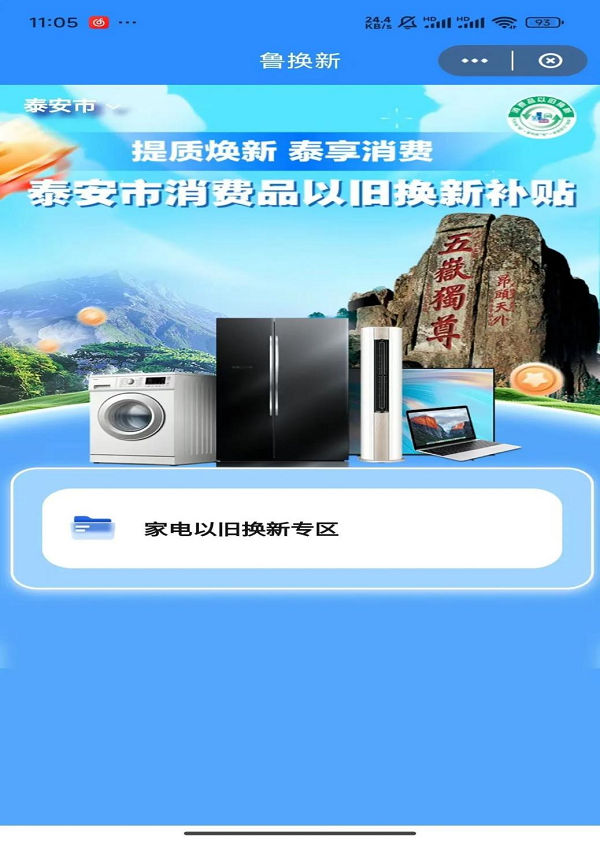 用戶登錄云閃付 app,搜索進入“魯換新”小程序,點擊左上角“請選擇地市”,在下拉菜單中選擇“泰安市”,點擊確認,進入泰安市消費品以舊換新補貼界面,或搜索“魯換新”小程序獲取你的地理位置泰安市,確認同意,可進入泰安市消費品以舊換新補貼界面,點擊進入“家電以舊換新專區(qū)”。